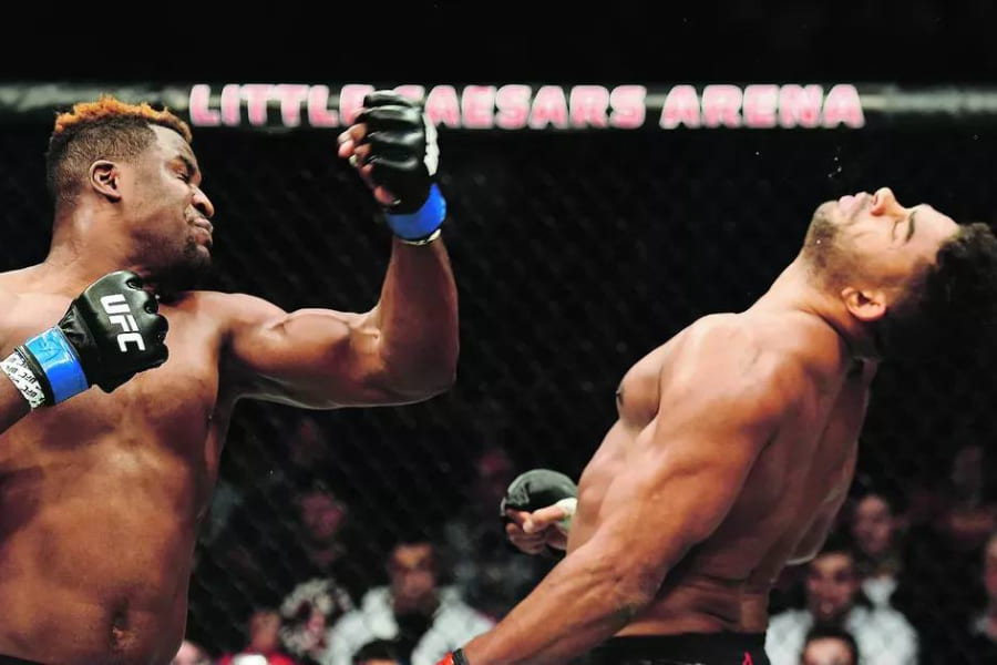 Francis Ngannou fait ses débuts à l’UFC en décembre 2015, au Preliminary Card de l’UFC on Fox 17, et s’impose par KO au deuxième round face à Luis Henrique. Ce qui suit est une série de destructions méthodiques qui terrorise la catégorie des poids lourds. En 2018, il assomme Alistair Overeem avec un uppercut dévastateur qui restera comme l’un des moments les plus marquants de l’histoire de l’UFC. Il écrase Cain Velasquez en 26 secondes. Il pulvérise Curtis Blaydes en 45 secondes. Sa violence de frappe est sans équivalent : il détient le record du plus grand nombre de KO avant la deuxième minute dans l’histoire de l’UFC poids lourds.